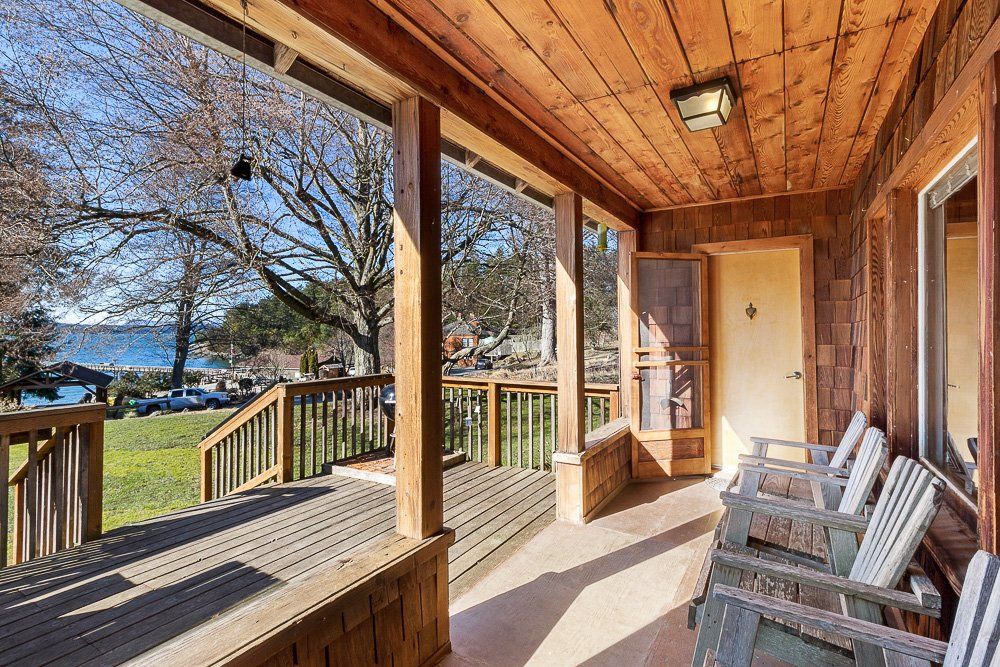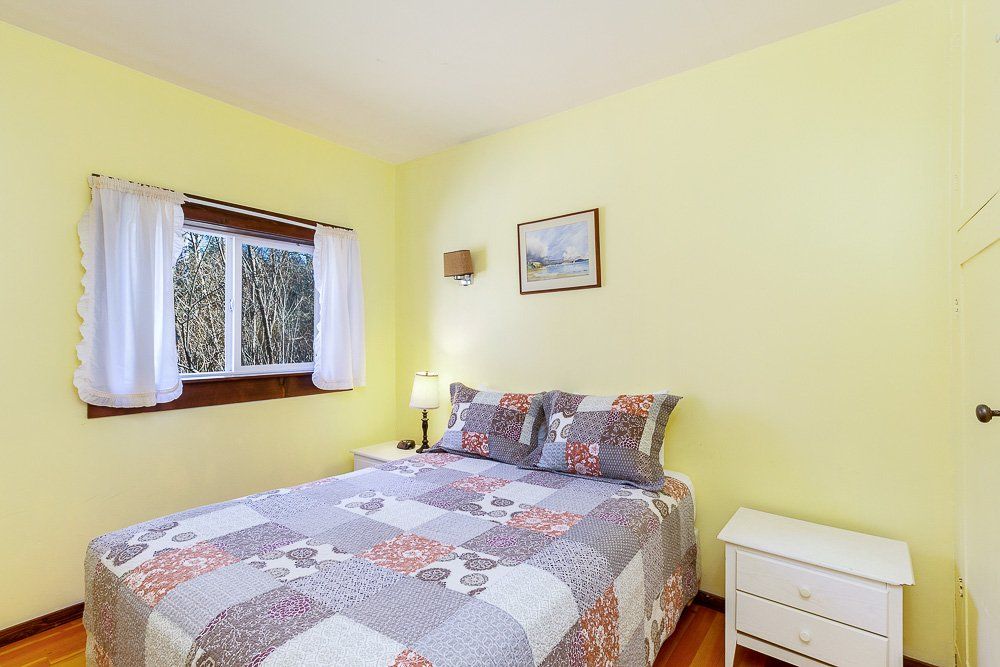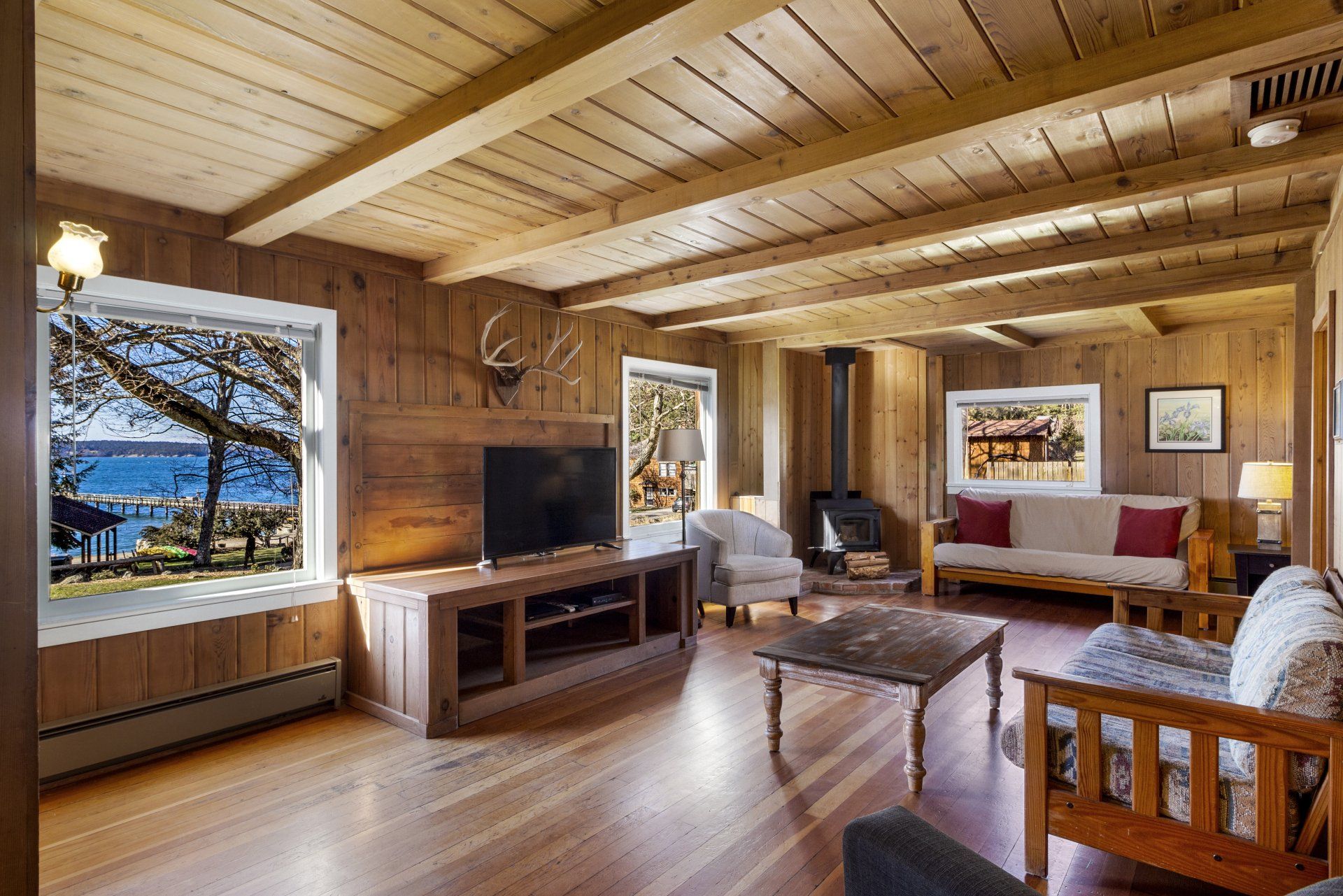 The living area features a large central area with great views toward the water. Included are a couch, futon, reading chairs, DVD, and satellite TV with music channels, and a wood-burning stove. Electric heat is also provided throughout this unit. A door with a screen door leads from the living area to the front patio. Reclaimed hardwood fir floors and original cedar paneling give the Farmhouse that island charm you just can't find very often these days.