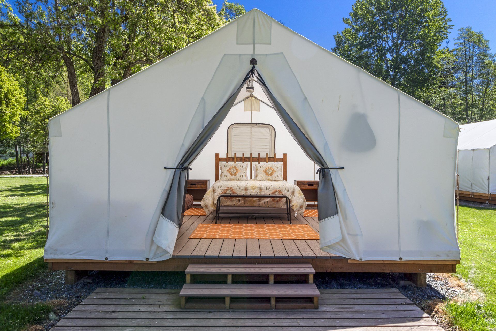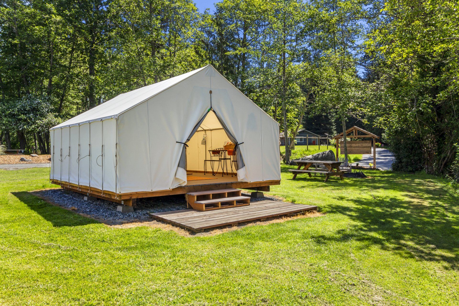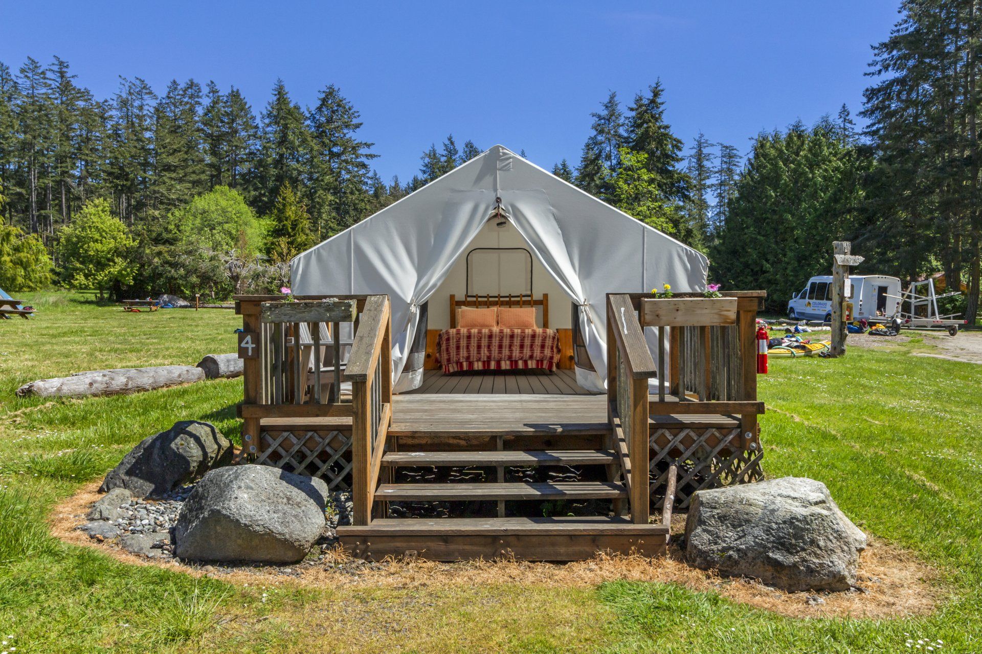 West Beach Resort deluxe Tent Cabins are comfortable, cozy units designed to allow you to enjoy the benefits of camping without the need to bring and set up your own equipment! We offer ocean-view, partial-view, and non-view Tent Cabins. The ocean view units have an amazing west-facing view overlooking the Canadian Gulf Islands. Catch the sunset from your private patio - the perfect end to a perfect day. Each Tent Cabin is a spacious 14x16 feet with a private deck and flower boxes. The canvas structure is elevated on a deck platform and has a queen bed, futon, table and chairs, park-style bbq grill with utensils, firepit, and picnic table. We also include linens, towels, basic toiletries, a bundle of firewood, and matches. There is plenty of grassy space off the front patio for your use. Enjoy an evening of BBQing, then settle down in the cedar Adirondack chairs and make that perfect S’more you’ve been talking about all year long! Ocean-view and partial-view units have power and water on a pedestal outside each unit. Non-view units have no power or water. There is no heat in the units. A central light and flashlight are included as part of your arrival kit. Pets allowed in certain units. Our Tent Cabins are a short (30 second) walk to the shower house for toilets, free showers, and a dishwashing sink. 2 night minimum, but call for one night openings as we may have off-booking availabilities. Wifi at each unit. All Tent Cabins are rated for 2 but can sleep up to 4.