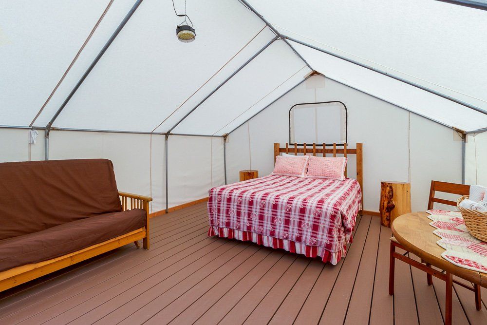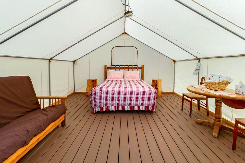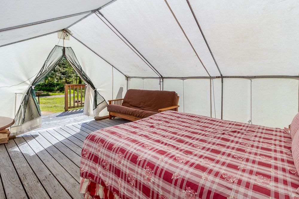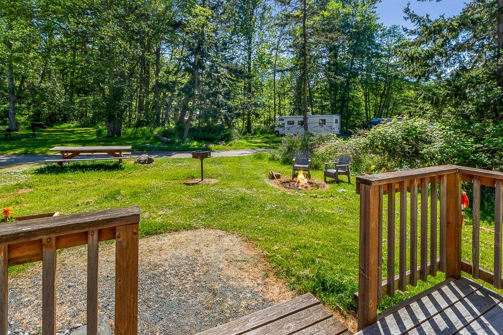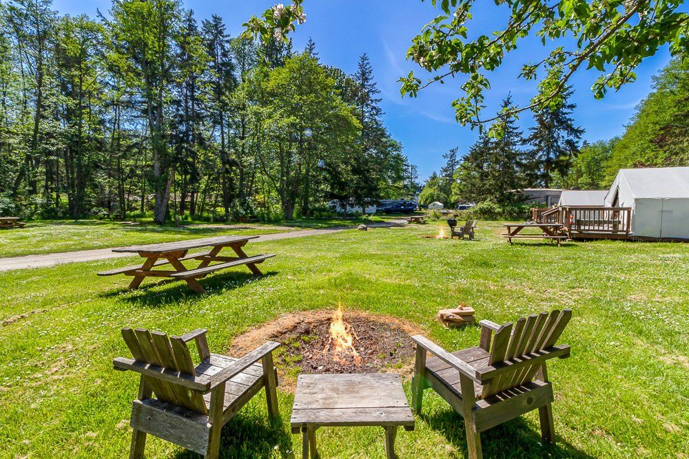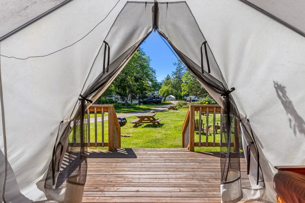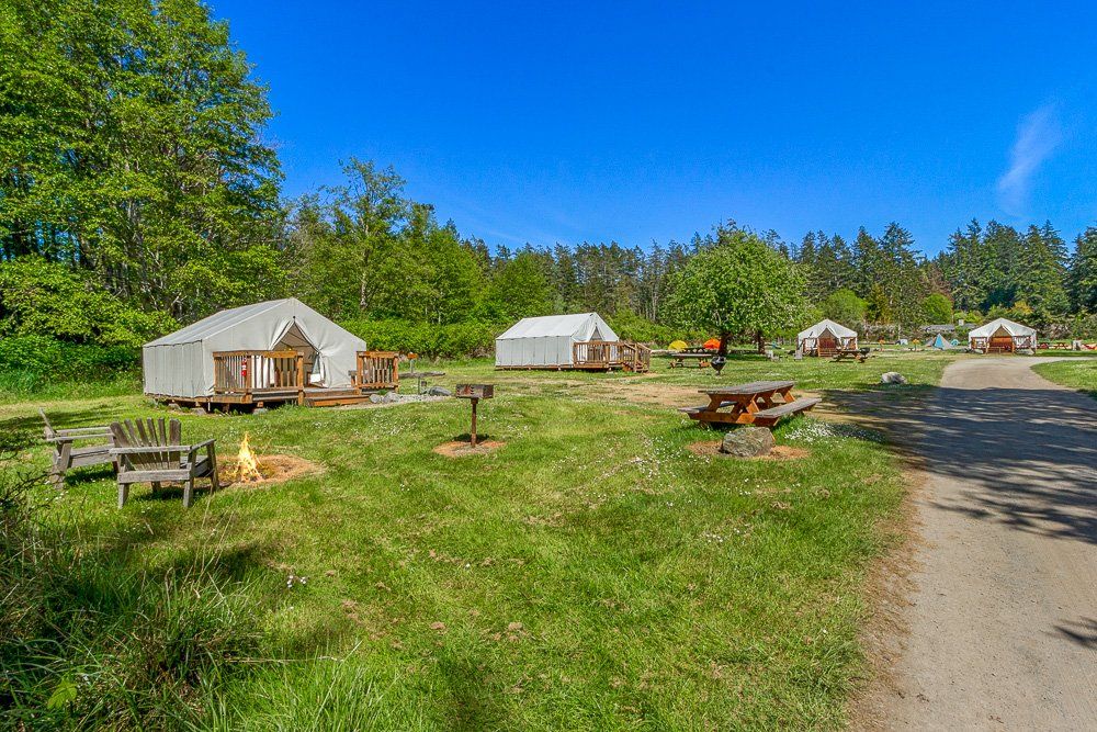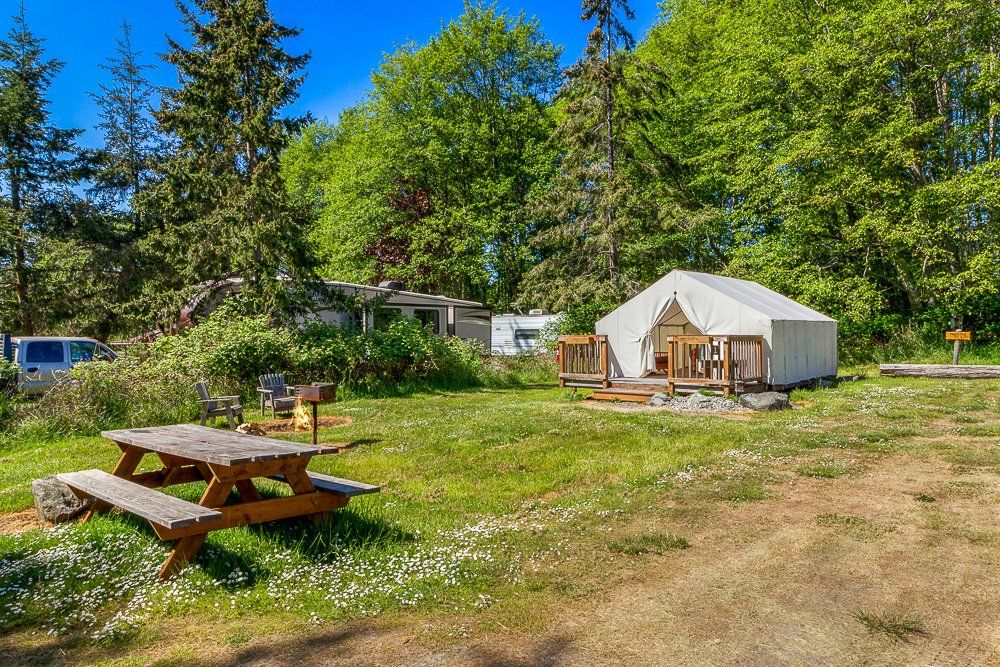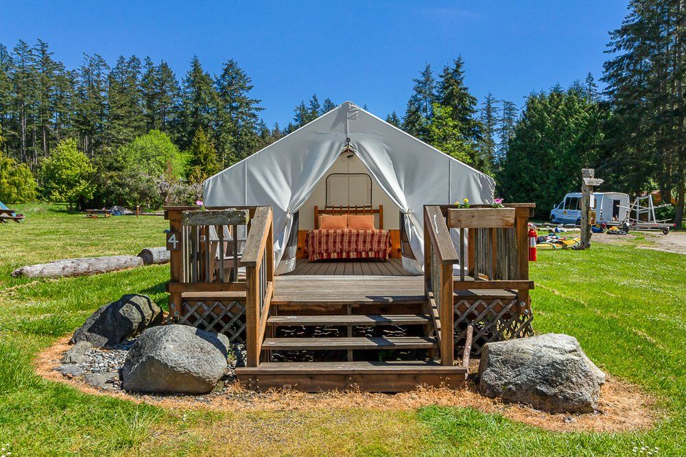 West Beach Resort deluxe Tent Cabins are comfortable, cozy units designed to allow you to enjoy the benefits of camping without the need to bring and set up your own equipment! We offer ocean-view, partial-view, and non-view Tent Cabins. The ocean view units have an amazing west-facing view overlooking the Canadian Gulf Islands. Catch the sunset from your private patio - the perfect end to a perfect day. Each Tent Cabin is a spacious 14x16 feet with a private deck and flower boxes. The canvas structure is elevated on a deck platform and has a queen bed, futon, table and chairs, park-style bbq grill with utensils, firepit, and picnic table. We also include linens, towels, basic toiletries, a bundle of firewood, and matches. There is plenty of grassy space off the front patio for your use. Enjoy an evening of BBQing, then settle down in the cedar Adirondack chairs and make that perfect S’more you’ve been talking about all year long! Non-view units have no power. water, or heat. A central light and flashlight are included as part of your arrival kit. Pets allowed in certain units. Our Tent Cabins are a short (30 second) walk to the shower house for toilets, free showers, and a dishwashing sink. 2 night minimum, but call for one night openings as we may have off-booking availabilities. WiFi at each unit. All Tent Cabins are rated for 2 but can sleep up to 4.